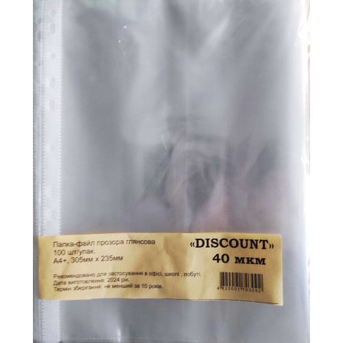 Файл А4+ (40мкм), глянцевый, "DISCOUNT" (100шт) 300658