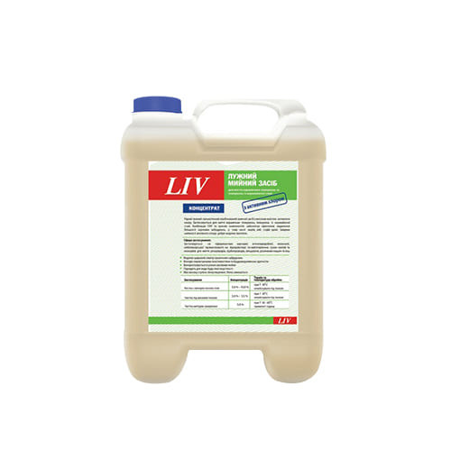 LIV Засіб миючий лужний для миття виробничого обладнання з активним хлором Для миття обладнання виробничого призначення ідеально підійде миючий засіб TM «LIV». За рахунок наявності активного хлору рідина є висококонцентрованою і підходить тільки для професійного використання. Основне призначення – видалення органічних забруднень із поверхонь промішеного обладнання (білки, жири, залишки овочів чи фруктів, пігментів природного походження). За рахунок LIV очищаються конвеєри, технологічні столи, обладнання нагрівального та морозильного призначення. Практичність миючого засобу дає можливість проводити ручне чищення або машинну. Запобігає появі розлучень, плям, білкових плівок. Оскільки у складі використовуються активні компоненти, знищуються вегетативні мікроби, і навіть їх суперечки. Засіб не впливає на руйнування поверхонь та залишає блиск, чистоту.